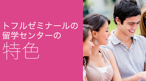 トフルゼミナール留学情報センターでは、国内学習での充分な英語力習得とさまざまなバックアップサポートを提供。進学希望、英語力により留学先を決める「個人留学」と当校が厳選し、提携した大学への進学をする「提携留学」と、いろいろな選択肢の中で進学先を選択いただけます。また社内のキャリアセンターからは帰国後を見据えた就職サポートまでトータルサポートをご提供します。