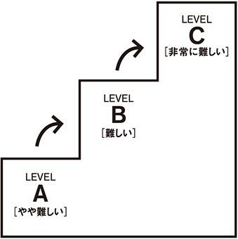 問題の難易度は全体的に高めに設定していますが、その中でさらに以下の3段階に分かれていますので、現在の実力に応じてチャレンジしてください。