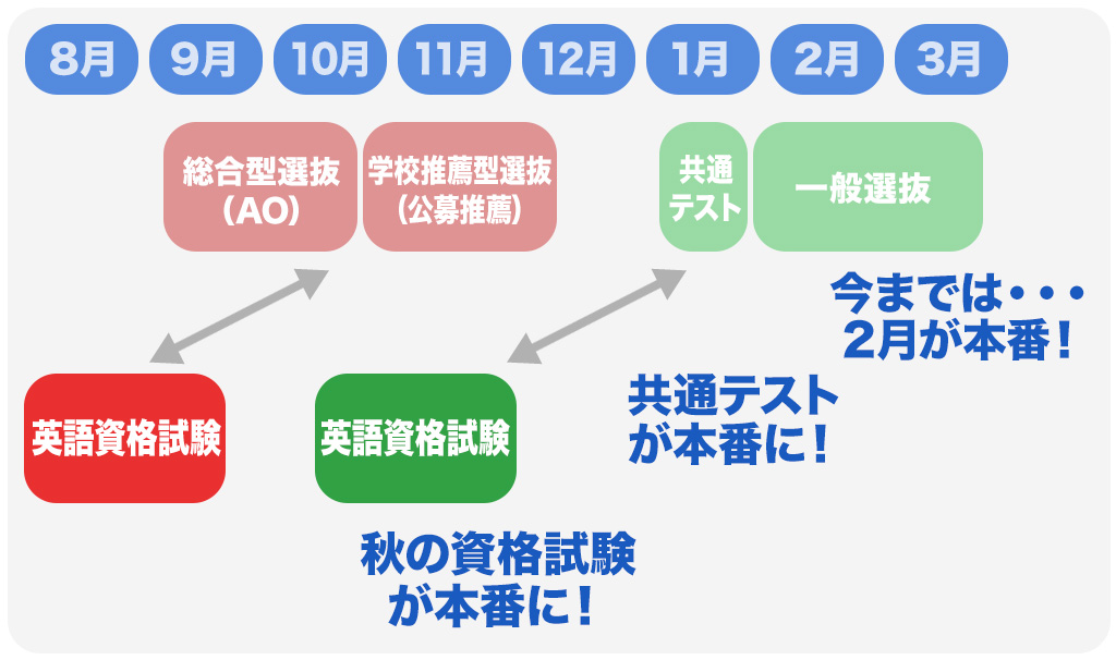今までの一般選抜では主に1~2月が本番でした。現在は英語資格試験利用入試も増えており、この英語資格試験の受験においては高3の秋がラストチャンスになります。