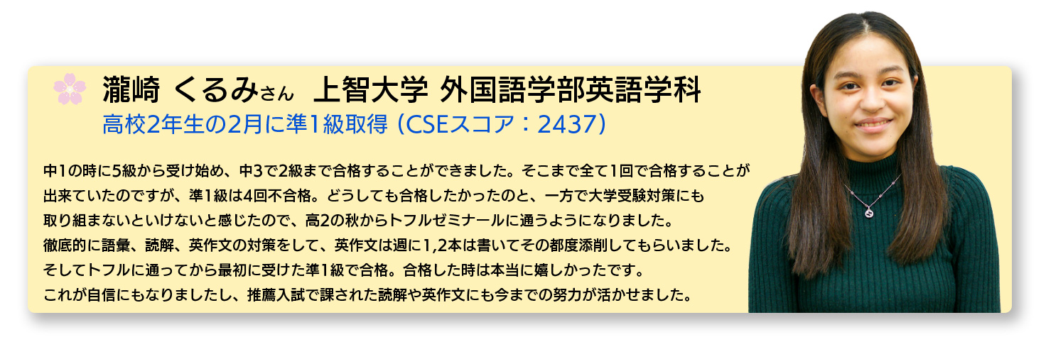 トフルゼミナールでは、英検®各級合格が最終ゴールではなく、4技能を段階的に学習していくことで、長く使える英語力の土台を築くことを真の学習目標としています。英検®1級・準1級・2級に合格できるテストスキル、そして難関大学や海外留学を見据えた講座を用意しています。