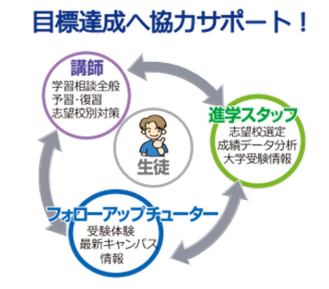 学習の進め方や学校の授業や部活との両立などの相談を、自身の経験から答えてくれたり、休んだ授業の補習もマンツーマンでお手伝いします。また通学が難しい学生はオンラインでフォローアップを受けることもできます。