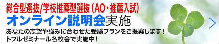 総合型選抜/学校推薦型選抜(AO・推薦入試)対策を長年指導している専門講師が講座を担当します。トフルゼミナールの講師陣は、そういった入試問題に対する研究活動を怠りません。トフルゼミナールの講師陣は、まさに合格のためのプロ集団なのです。