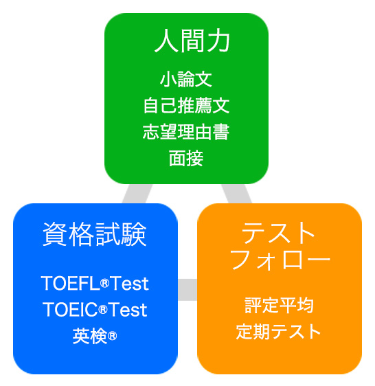 総合型選抜/学校推薦型選抜(AO・推薦入試)においても、英語力は強い武器となります。実践英語力を測るTOEFL®TestやTOEIC®Testのスコアを、英語試験の代替として積極的に取り入れている大学も多くあります。