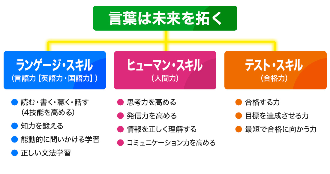 トフルゼミナールでは上記の3つの力を有機的に結合し、 ランゲージ・スキル=英語4技能(話す、書く、読む、聴く)を複合的に学び、さらに国際人として必要なヒューマン・スキル=言語力の基礎となる思考力(考える)・背景知識を身につけて頂くようなカリキュラムを様々ご用意しています。