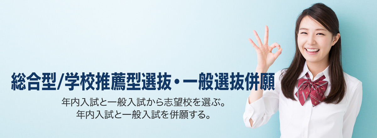 総合型選抜(AO入試)、学校推薦型選抜(公募推薦・指定校推薦入試)など、年内に合否が判明する入試の総称です。基礎学力テスト型の学校推薦入試も増加しています。