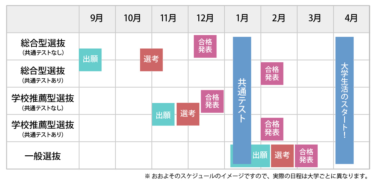 1月に実施される共通テストと、2月に実施される国公立大や私立大の個別試験の総称(一般選抜)。英語外部試験利用入試(英検、TOEFLなど)や共通テスト併用入試など、多様化が進んでいます。