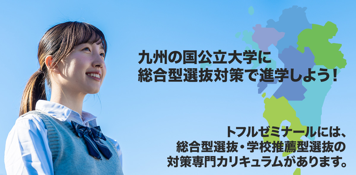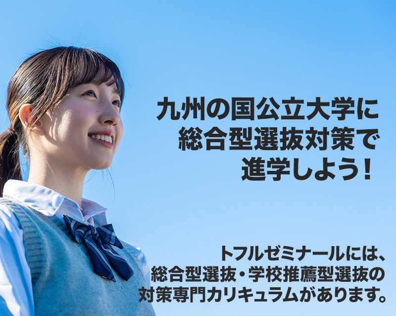 夏休み、オープンキャンパスに参加する際、九州大学法学部にGVプログラムがあるということを知りました。志願理由書の書類選考と大学入試センター試験のほかに、英語の筆記試験と日本語、英語での面接という試験内容でした。過去の試験内容について、情報を得ることが難しく、対策方法に悩んでいたところ、ダイレクトメールを受け取り、トフルゼミナールに入塾しました。志願理由書の添削や、筆記、面接試験対策などを個別でご指導いただきました。受験生は、自身が取得している実用英語技能検定などの合格通知書類を出願時に提出する必要があるので、早めにチャレンジしておくことをおすすめします。センター試験も加味されるため、全教科バランスよく対策しつつ、英語に関しては、重点的に学習する必要があると思います。試験直前には、同時にたくさんの対策をしなくてはならないため、AO入試を受験する方は、早めに準備されることをおすすめします。