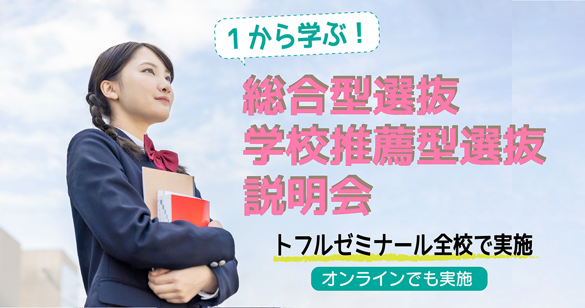 総合型選抜・学校推薦型選抜の種類・選考方法・合格のポイント・必要な準備についてお話する「1から学ぶ総合型・学校推薦型選抜」個別説明会を全校のトフルゼミナールで実施します。