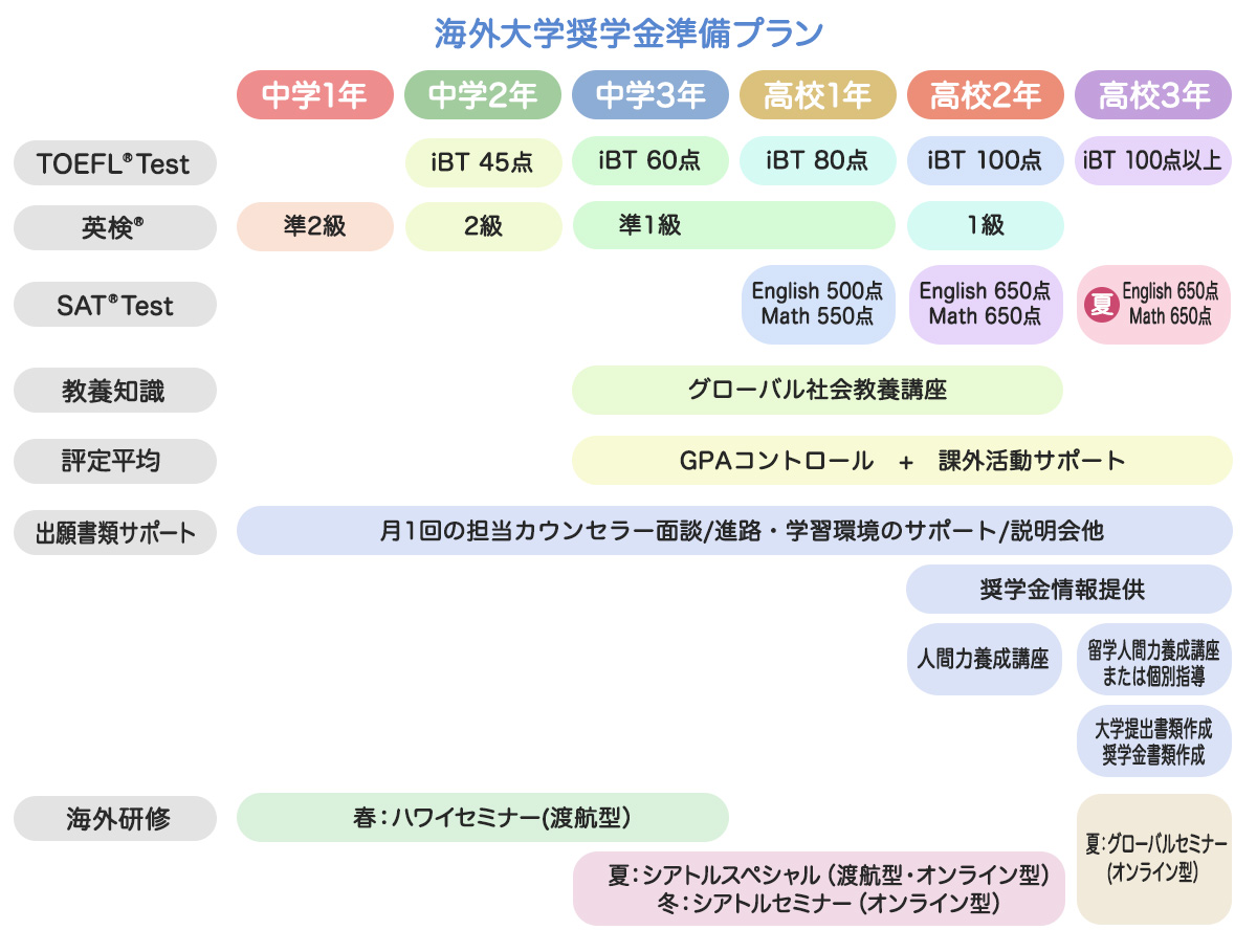 特に英米のトップスクールを狙うのであれば、まずは高校入学時までに、遅くとも高校2年生終了時までにTOEFL iBT 100(英検1級相当)以上+高3の前半までにSAT1400点以上を取得し、高3時には様々な奨学金制度を活用するためのエッセイや面接対策を個別指導で受講するのがベストなシナリオになります。もちろん英語力の準備が上記のレベルまで整っていれば、日本の難関大学を推薦系入試や一般選抜で併願することも可能になります。