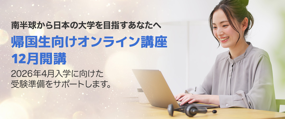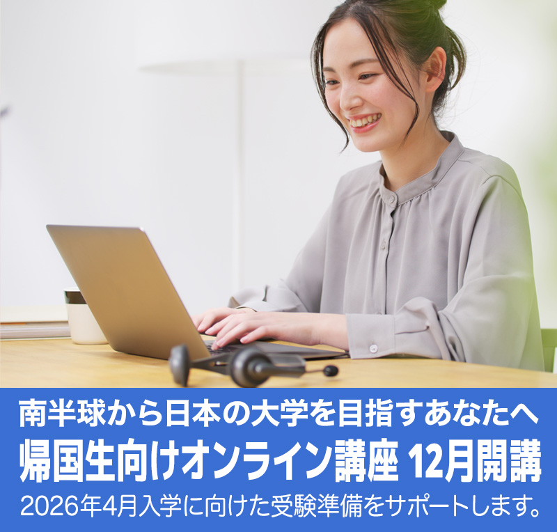 主な対策は帰国生入試の出願及び筆記試験で要求される①出願対策(志望理由書対策・英語資格)②筆記試験対策(総合英語力、小論文他)です。特に海外に居ながら帰国生入試に出願をするオセアニアからの帰国生にとって、出願時期を迎える7月~8月は時間的制約の中で大学選定、出願準備、出願と重要な時期を迎えます。第一志望の大学合格に向けて12月からの早期スタートは帰国生入試への合否を左右する鍵となります。是非この冬、海外からスタートする「オンライン・オセアニアスペシャルプログラム」で希望合格に向けて学習を開始しましょう。