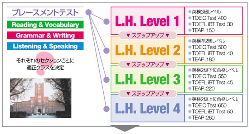 トフルゼミナールのL.H.プログラム(Language & Human Skills)は、大学受験や英語資格試験試験対策の準備や、英語力そのものの向上を図る講座です。学年の区別はなく、英語力に応じて最も効果をあげられるレベルから受講し、ステップアップ方式により4技能の英語運用能力の向上を図ります。